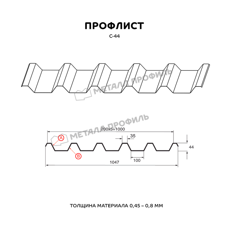 Профлист имеет форму С-44, которая обеспечивает ему высокую жесткость и устойчивость к нагрузкам. Он легко монтируется и обладает хорошей устойчивостью к воздействию атмосферных условий, ультрафиолетового излучения и коррозии.