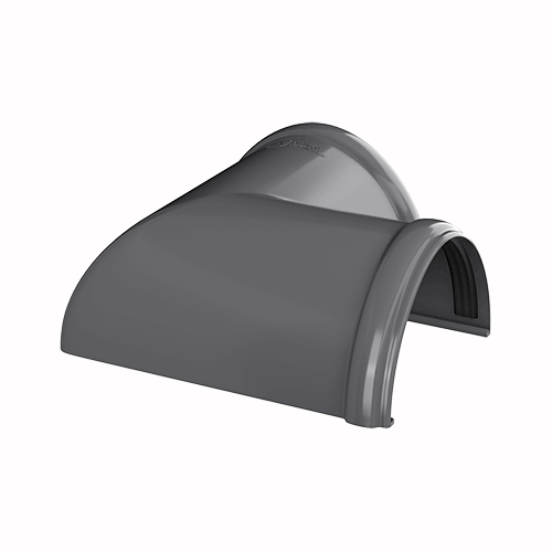 Угол желоба предназначен для соединения желобов на карнизах, которые лежат в одной плоскости, но расположены перпендикулярно относительно друг друга.