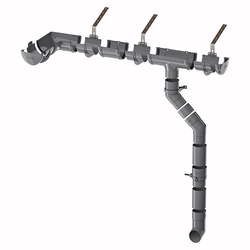 В состав системы входят все необходимые доборные элементы для организации полноценного отведения дождевой и талой воды с крыш и навесов.